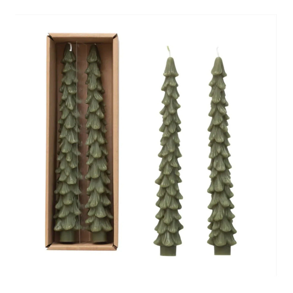 This pair of 10" rustic tree-shaped taper candles are perfect for your Christmas or winter table! They have a classic evergreen tree shape and are an effortless way to add both style and ambience to your home. Candles are unscented and are sold as a boxed set of two. Perfect for intimate gatherings, dinners, and parties or for making everyday meals feel special.