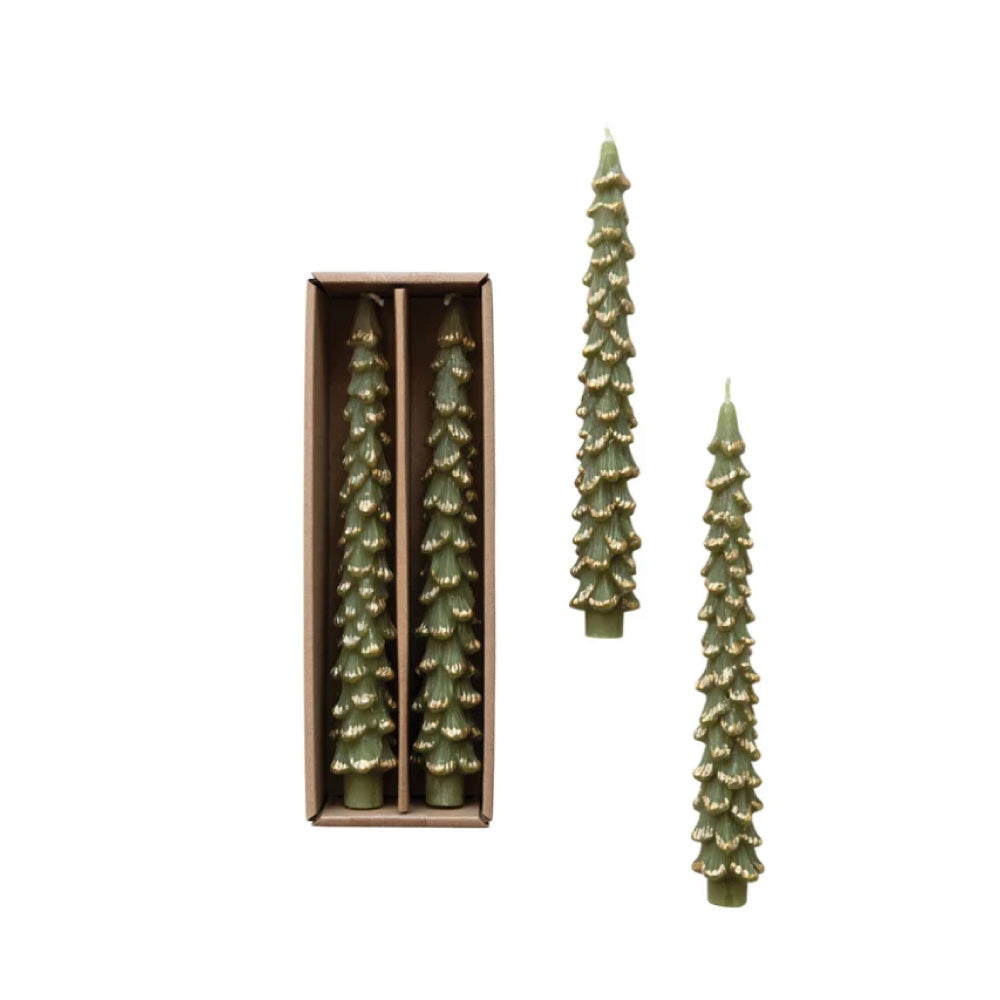 10β Unscented Tree Shaped Taper Candles w/ Gold Tips in Box, Evergreen Color, Set of 2