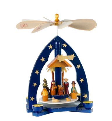 A wooden, European style Christmas period with a nativity scene. The heat from lit candles causes the windmill at the top to spin.