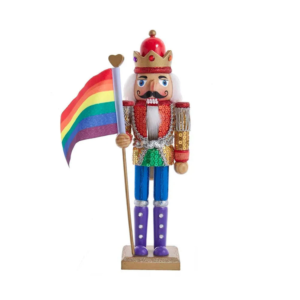 This Pride nutcracker is a beautiful addition to any holiday décor. It features the iconic Pride rainbow colors with multi-color sequined and gemstone accents. This nutcracker is holding the Pride Flag and stands on a gold glittered base