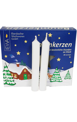 A box of 20 candles for German Christmas pyramids that take thinner candles. These also work well for candle clips and for chimes. These will fit any non-tea light Christmas pyramid we carry.
