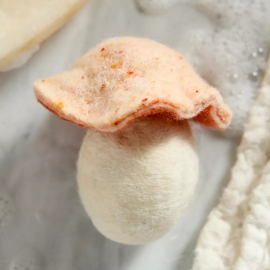 A hand-felted sheep wool mushroom with a scented, natural soap inside. This is essentially a hand and body soap with a loofah and sponge all in one. As the soap gets smaller, so does the wool Once the soap is gone the felted item can be used as a scrubby or decoration. Does not need to be rinsed after use, the wool felt will soak the lather back up, allowing the soap to last for several months.