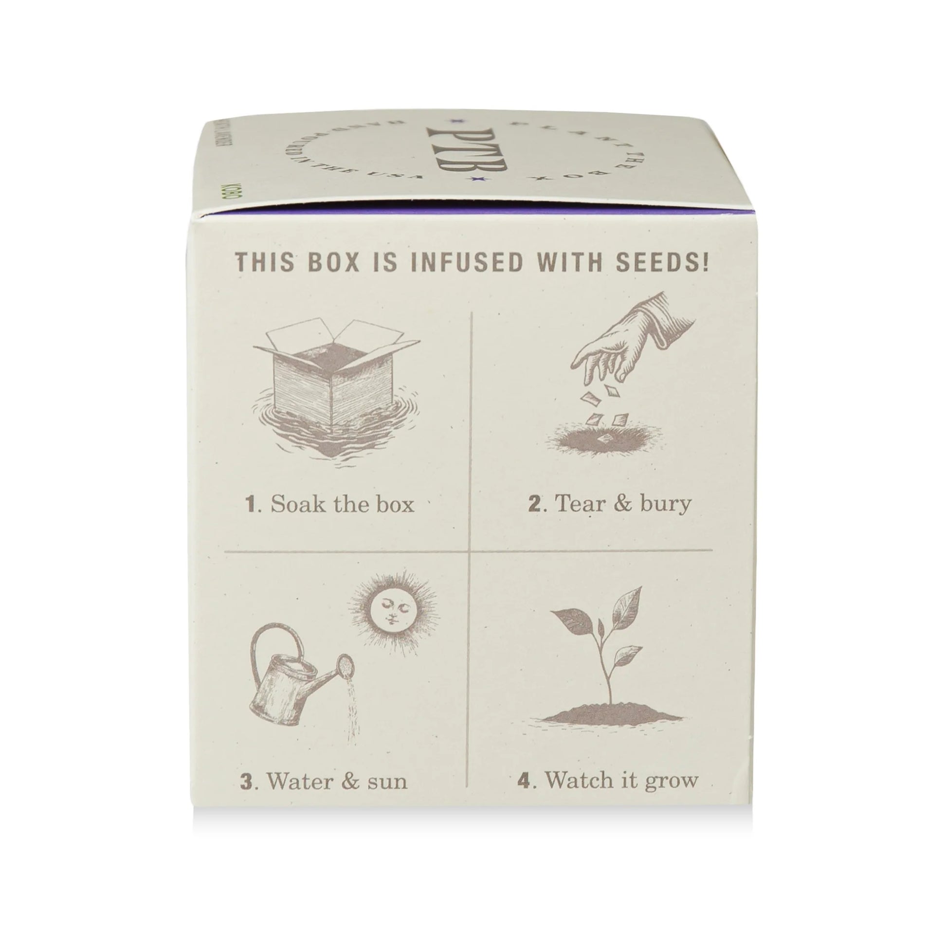 The scent of fresh linens, perfume of lavender distilled from nature’s own hand, and the richness of dense wood. Plant the box and the seed-infused package will grow soothing lavender.