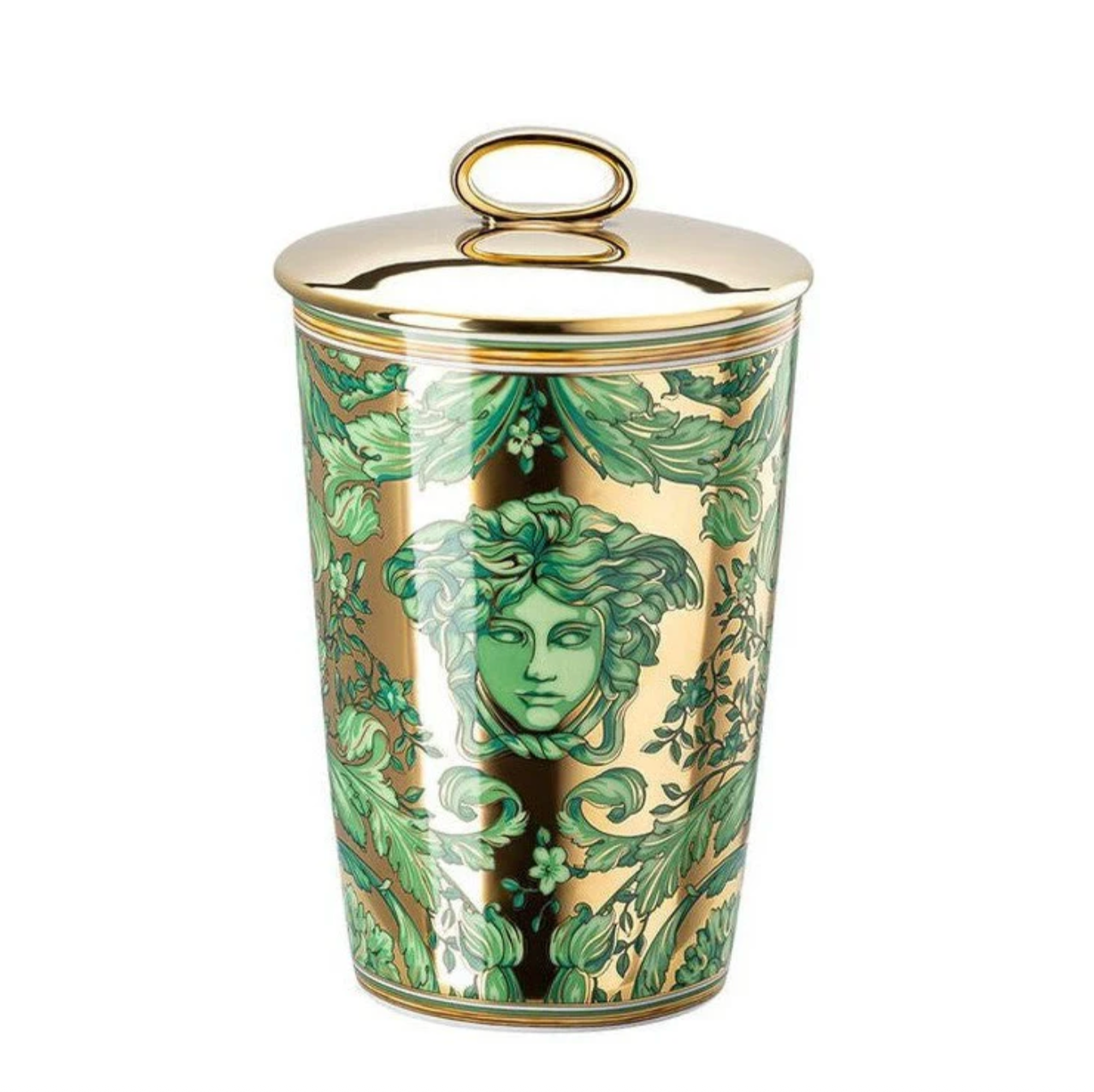 An opulent, Medusa-themed, lidded candle scented with a pear, summer meadow, and mandarin fragrance. Made in Germany from the finest porcelain.