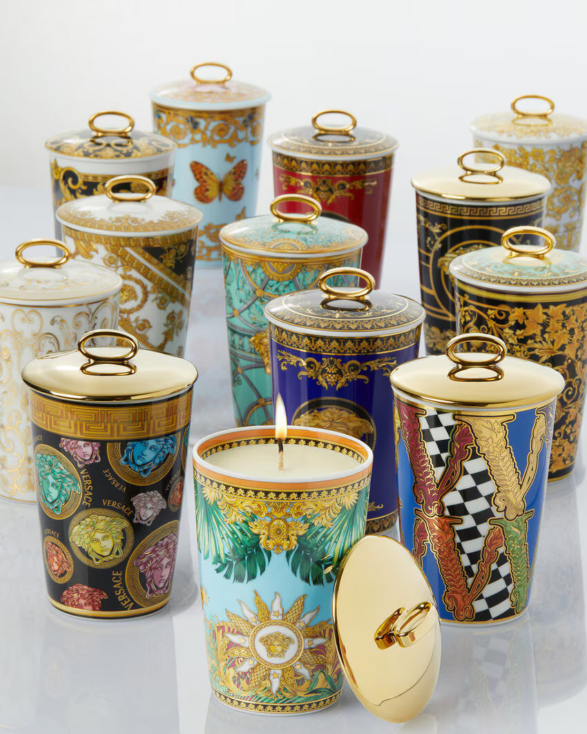 An opulent, lidded candle designed in a classic, Versace motif. Scented with Versace's floral Le Jardin de Versace fragrance. Made in Germany from the finest porcelain.